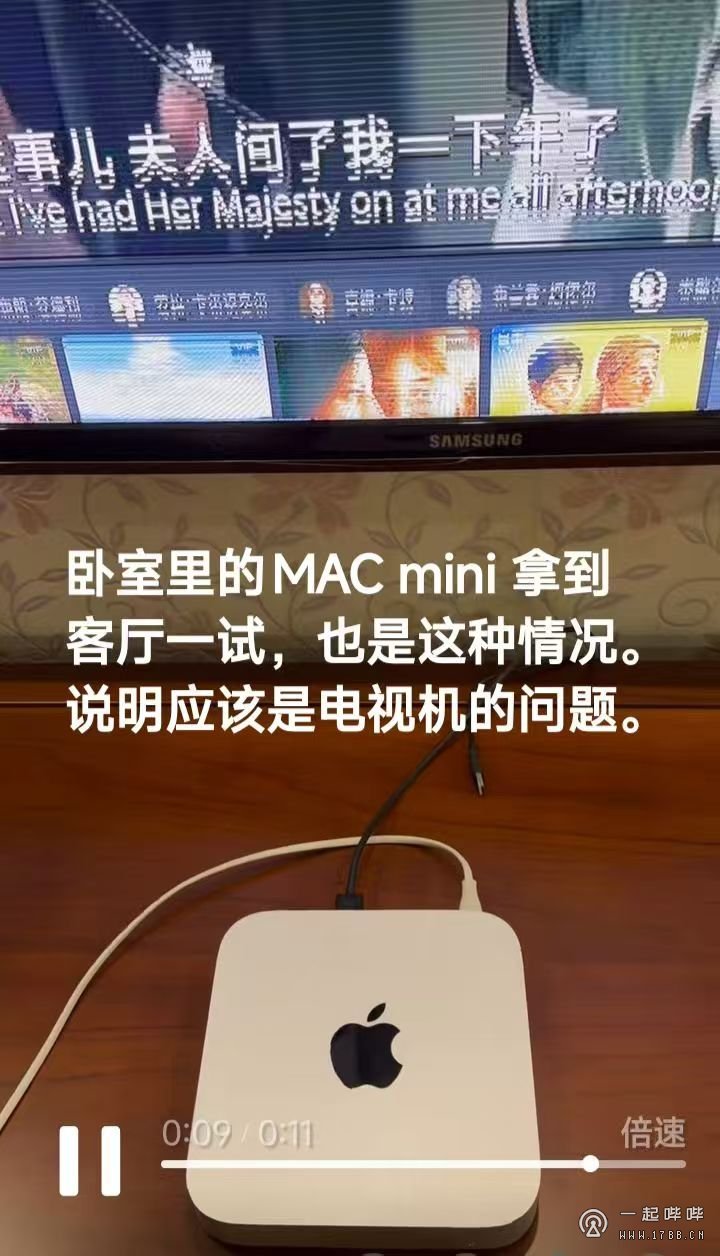 死马当活马送来检查。建议她把卧室另一台 MAC mini 拿厅里试试,结果是电视机的问题。